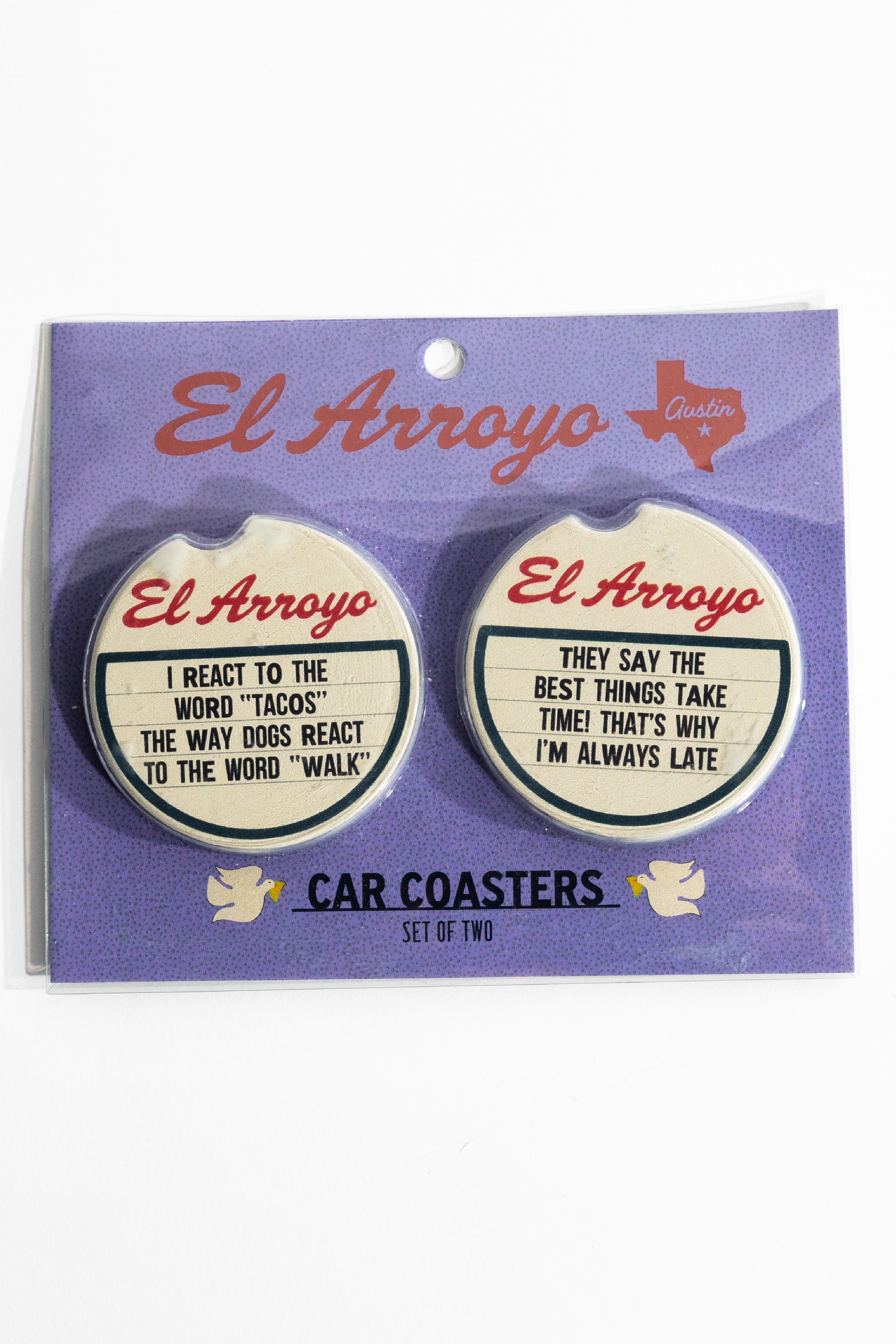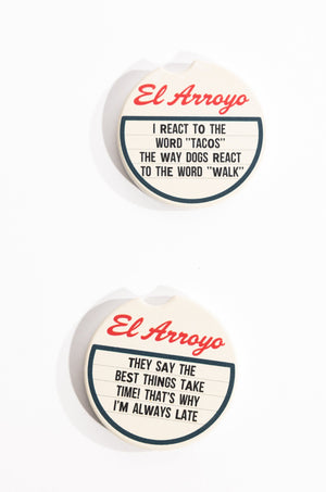 Never worry about spills in your car again with this hilarious Car Coaster Set! With two absorbent ceramic coasters, your drink holders will stay clean and dry even if you're always running late.