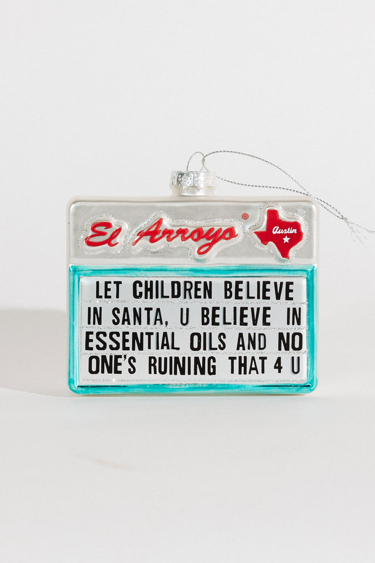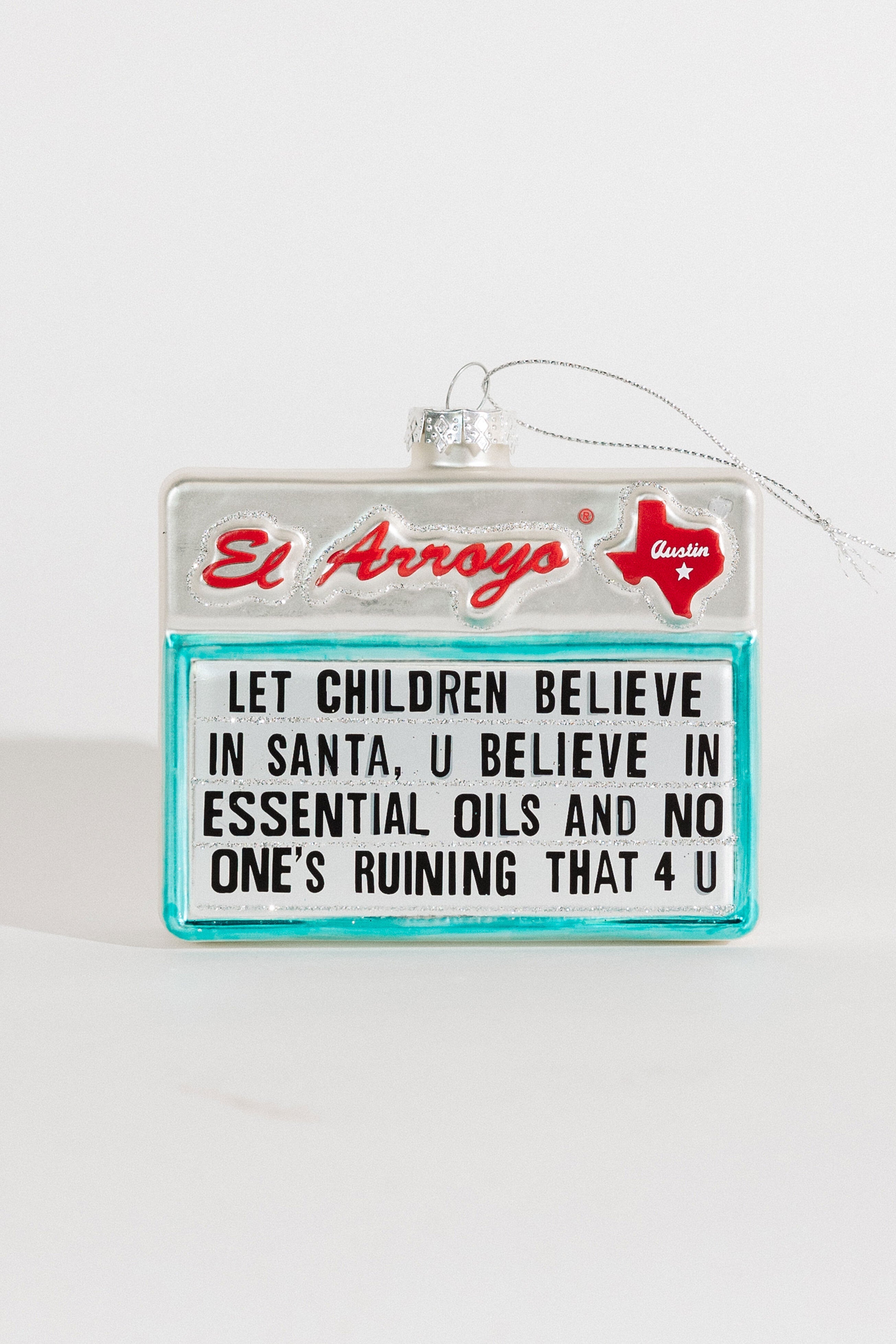 This one-of-a-kind ornament is sure to be a festive hit! Made from mercury glass, this marvelous marquee adds a touch of humor to your tree that can be treasured for years to come.