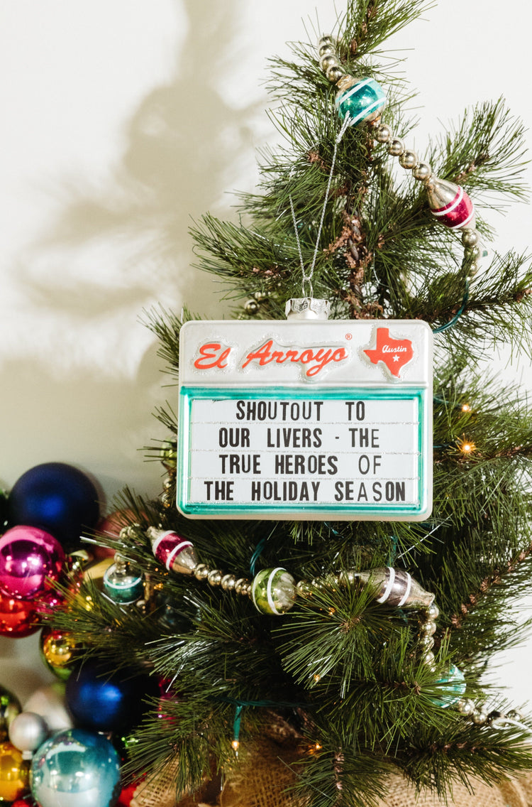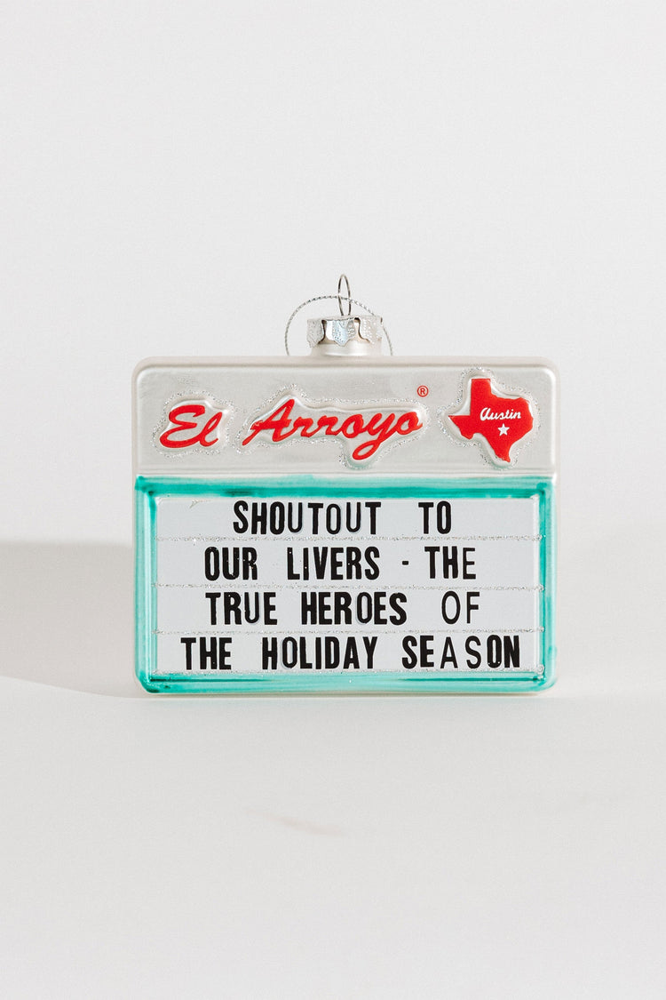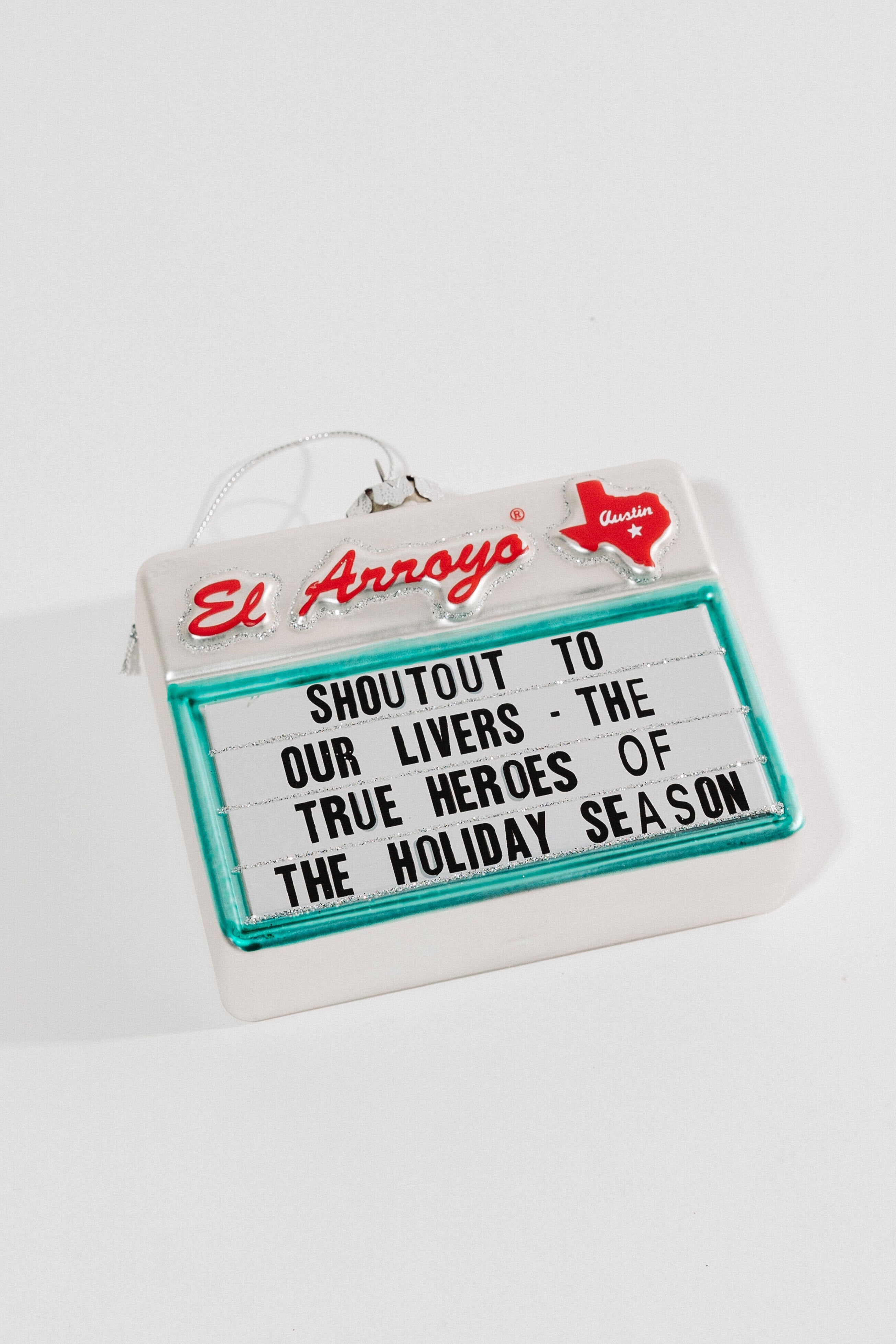 This one of a kind ornament is sure to be a festive hit! Made from mercury glass, this marvelous marquee adds a touch of humor to your tree that can be treasured for years to come.